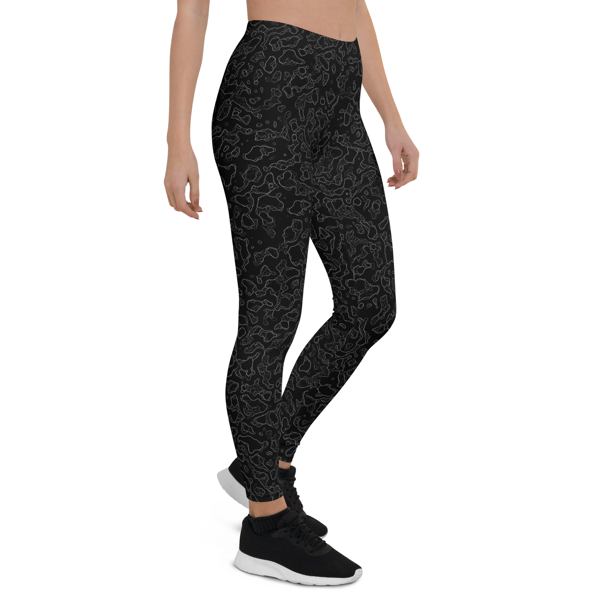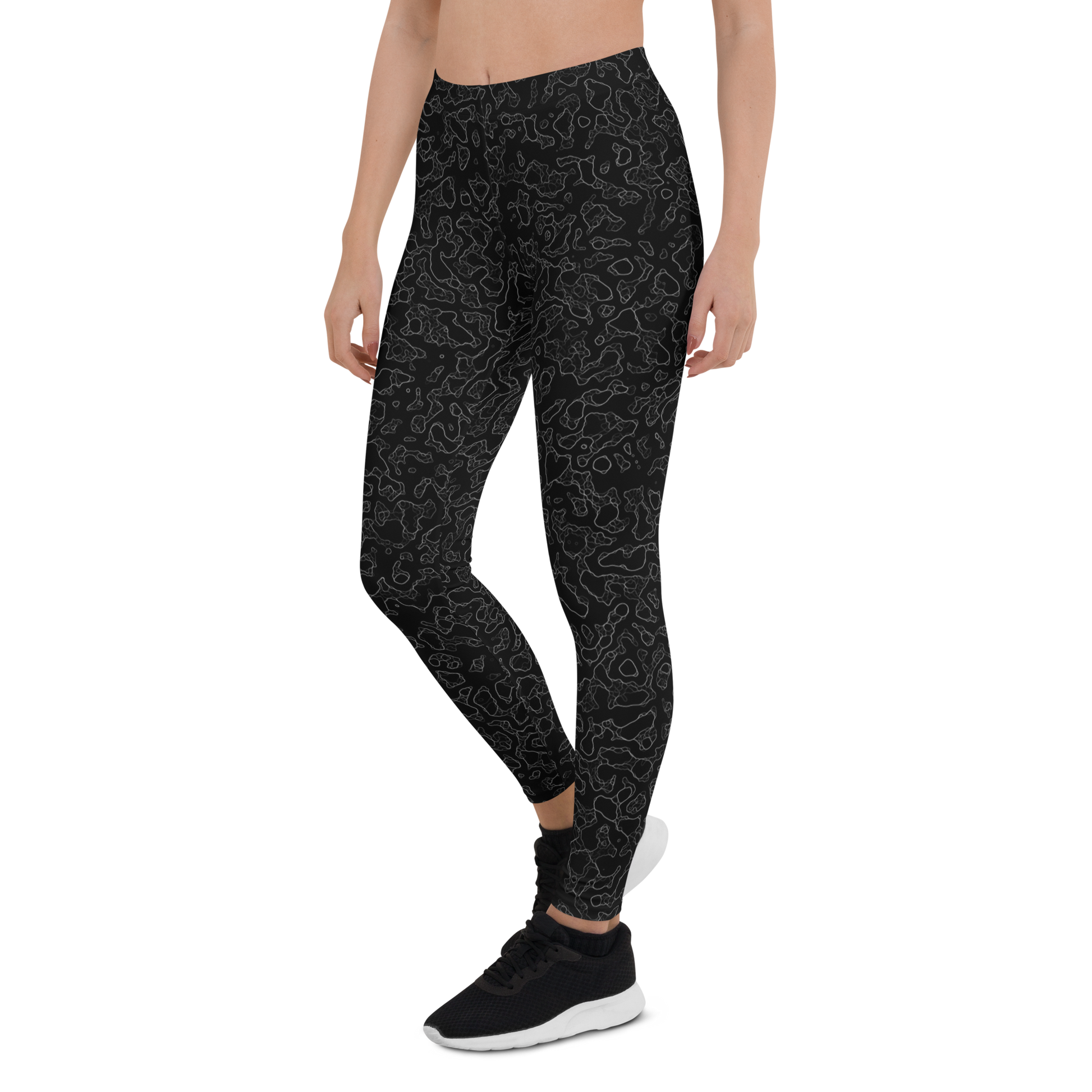 The collection includes pure black leggings, black camouflage, and hybrid designs that fuse animal, terrain, floral, and glitch motifs into blackout mode. Every piece here is bold through restraint — a masterclass in texture, tone, and the seductive silence of no color at all.