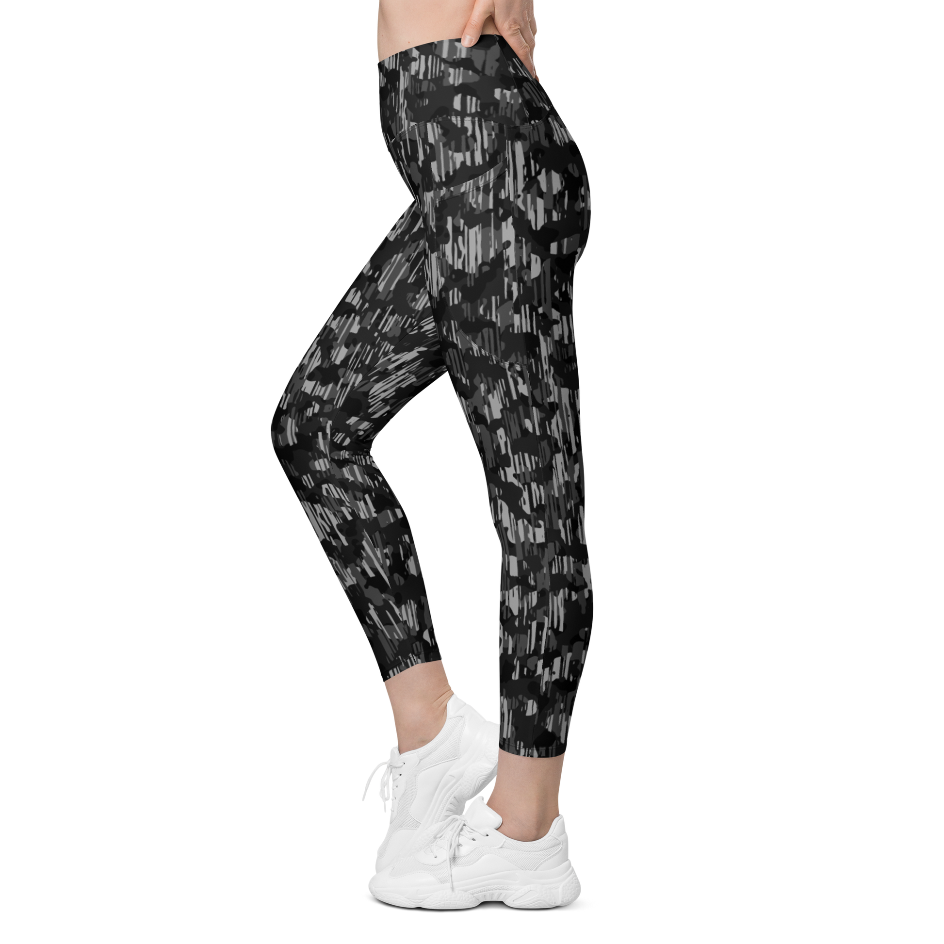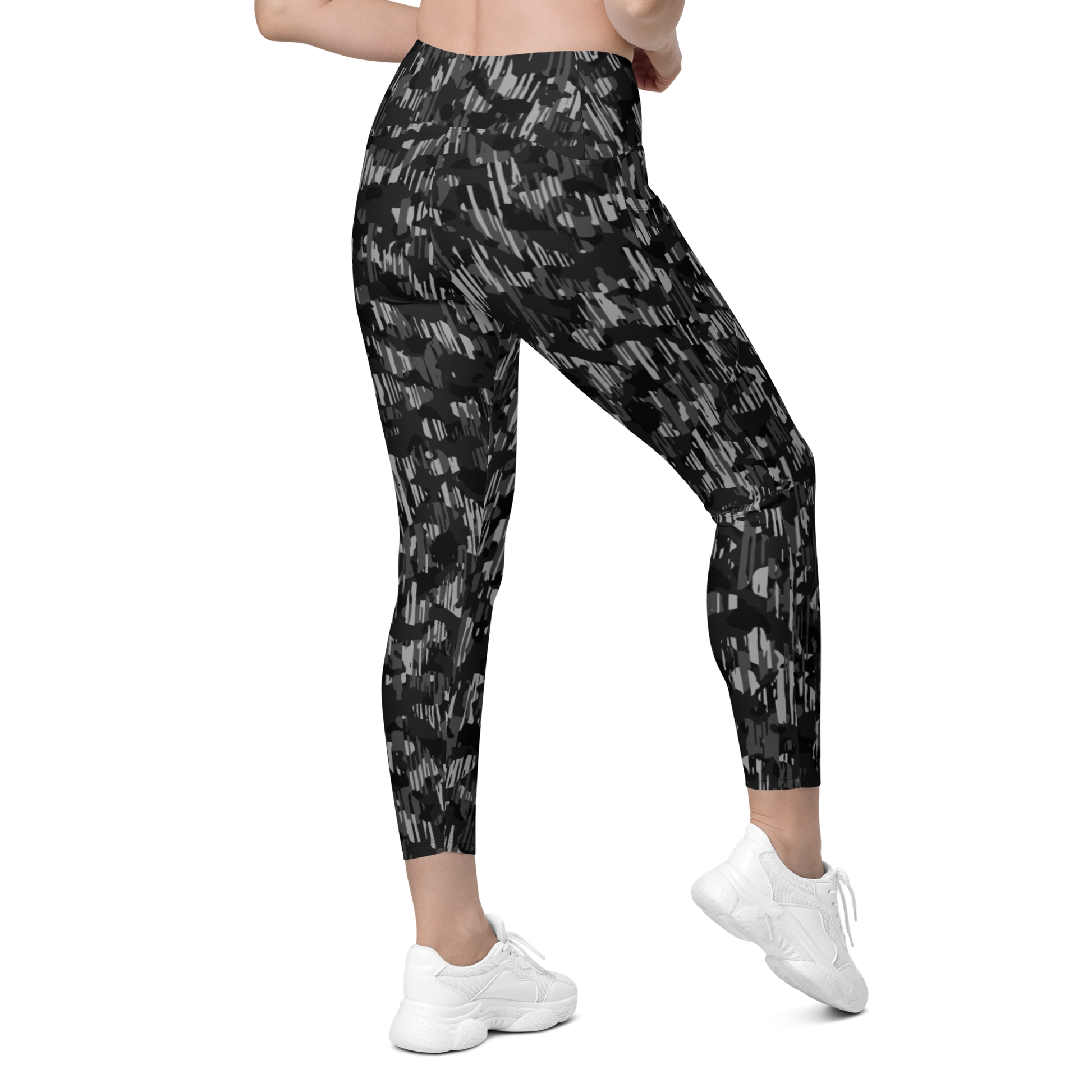 The collection includes pure black leggings, black camouflage, and hybrid designs that fuse animal, terrain, floral, and glitch motifs into blackout mode. Every piece here is bold through restraint — a masterclass in texture, tone, and the seductive silence of no color at all.
